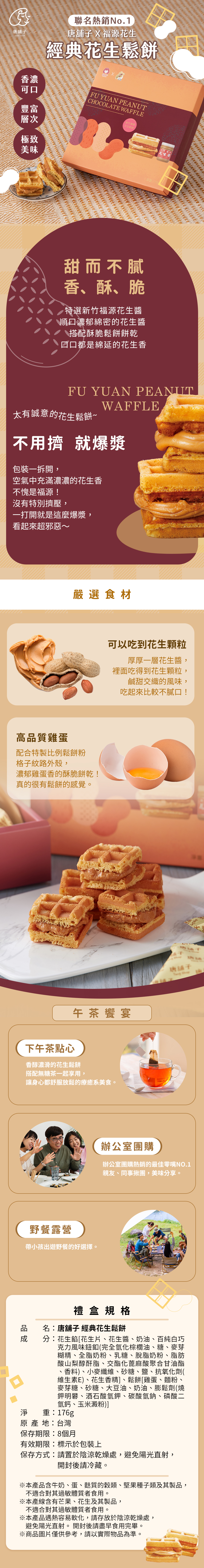 規格說明品名:福源花生鬆餅成分:花生餡[花生片、花生醬、奶油、百純白巧克力風味鈕釦(完全氫化棕櫚油、糖、麥芽糊精、全脂奶粉、乳糖、脫脂奶粉、脂肪酸山梨醇酐脂、交酯化蓖麻酸聚合甘油酯、香料)、小麥纖維、砂糖、鹽、抗氧化劑(維生素E)、花生香精]、鬆餅[雞蛋、麵粉、麥芽糖、砂糖、大豆油、奶油、膨鬆劑(燒鉀明礬、酒石酸氫鉀、碳酸氫鈉、磷酸二氫鈣、玉米澱粉)]淨重:176g原產地:台灣保存期限:8個月有效期限:標示於包裝上保存方式:請置於陰涼乾燥處,避免陽光直射,開封後請冷藏。※本產品含牛奶、蛋、麩質的穀類、堅果種子類及其製品,不適合對其過敏體質者食用。※本產線含有芒果、花生及其製品,不適合對其過敏體質者食用。※本產品遇熱容易軟化,請存放於陰涼乾燥處,避免陽光直射。 開封後請盡早食用完畢。※商品圖片僅供參考,請以實際物品為準。