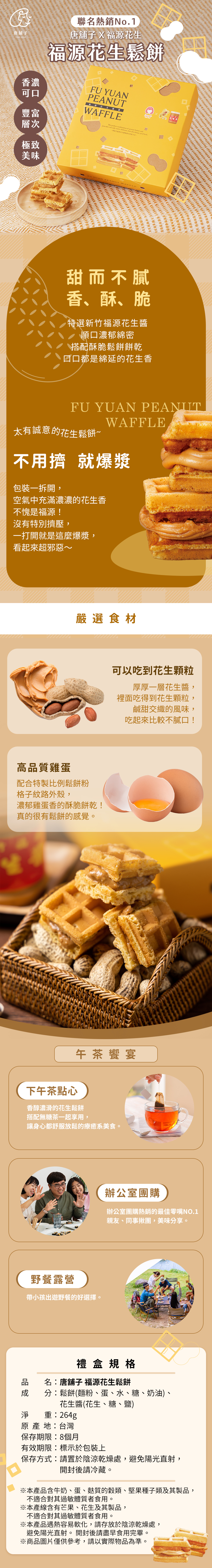 品名:唐舖子 福源花生鬆餅成分:鬆餅(麵粉、蛋、水、糖、奶油)、花生醬(花生、糖、鹽)淨重:264g原產地:台灣保存期限:8個月有效期限:標示於包裝上保存方式:請置於陰涼乾燥處,避免陽光直射,開封後請冷藏。※本產品含牛奶、蛋、麩質的穀類、堅果種子類及其製品,不適合對其過敏體質者食用。※本產線含有芒果、花生及其製品,不適合對其過敏體質者食用。※本產品遇熱容易軟化,請存放於陰涼乾燥處,避免陽光直射。 開封後請盡早食用完畢。※商品圖片僅供參考,請以實際物品為準。