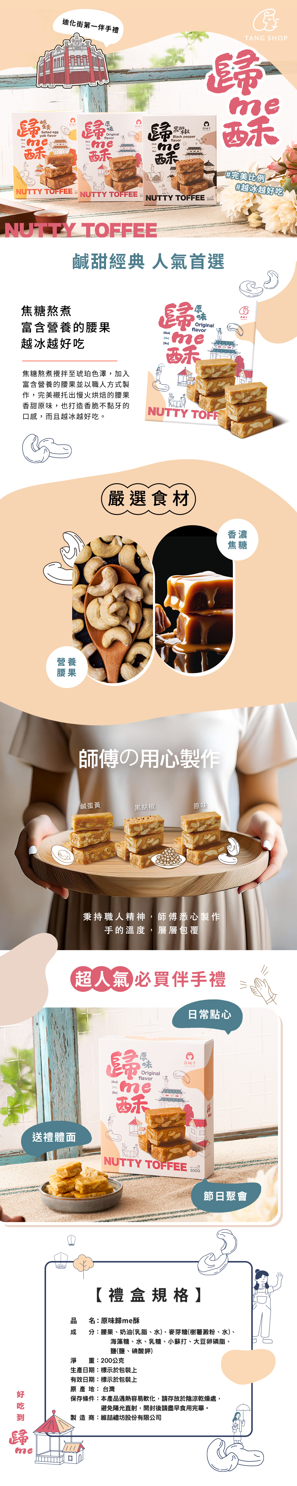 焦糖熬煮攪拌至琥珀色澤,加入富含營養的腰果並以職人方式製作,